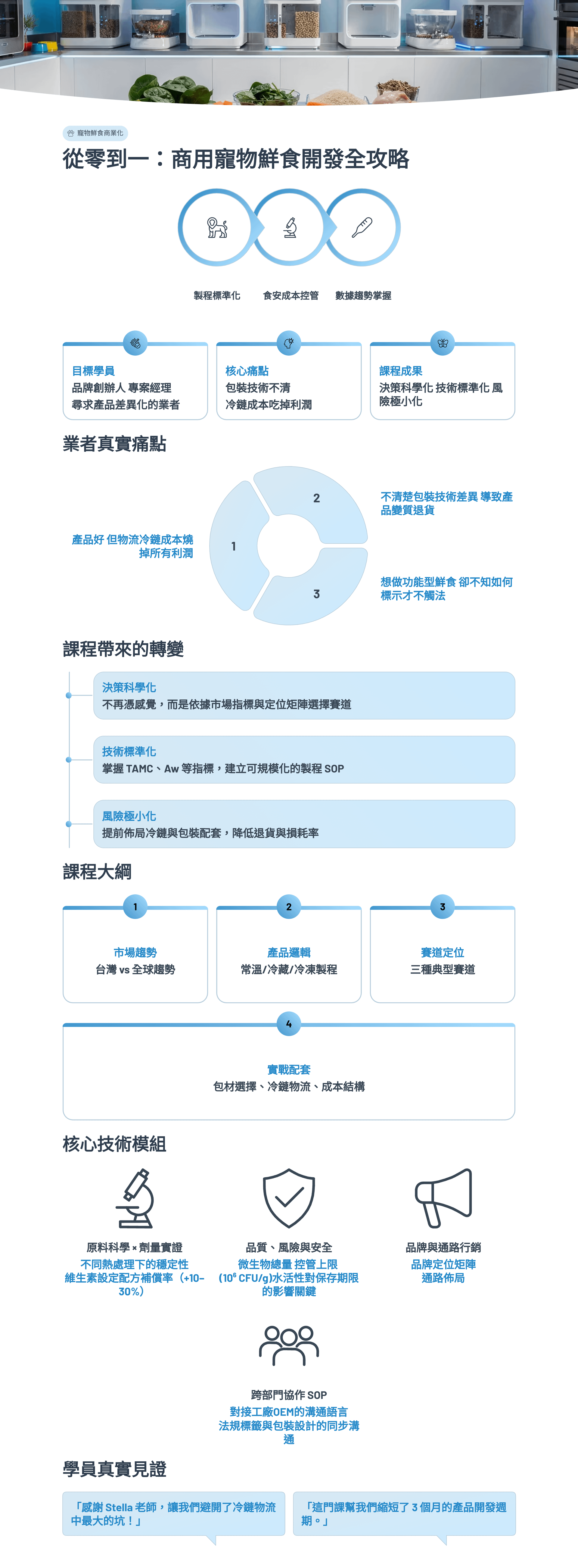 本課程專為想進入商用寵物鮮食領域的經營者設計。鮮食市場雖具高成長潛力,但隱含的「技術門檻、食安規範、冷鏈壓力」常是品牌失敗的主因。我們將帶領學員從市場趨勢出發,深度解析常溫與冷凍產品的製程差異,協助您在 1,500 億美元的全球寵食商機中,精準選定位於高端市場的優勢賽道