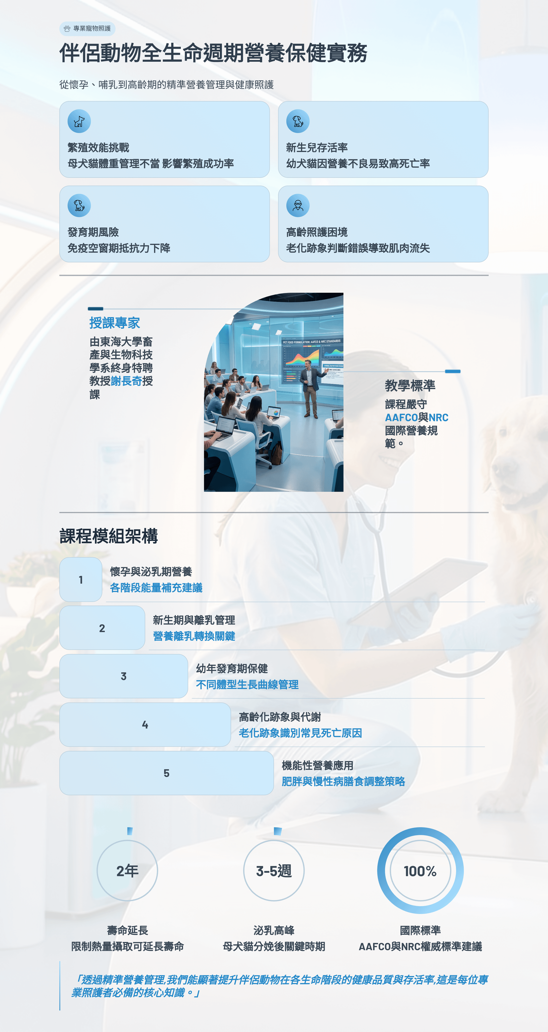 本課程由長期研究伴侶動物營養與代謝的學者出發,系統性解析犬貓在懷孕、哺乳、幼年成長與老年階段的營養需求差異,並延伸到配方設計、風險控管與產品溝通。