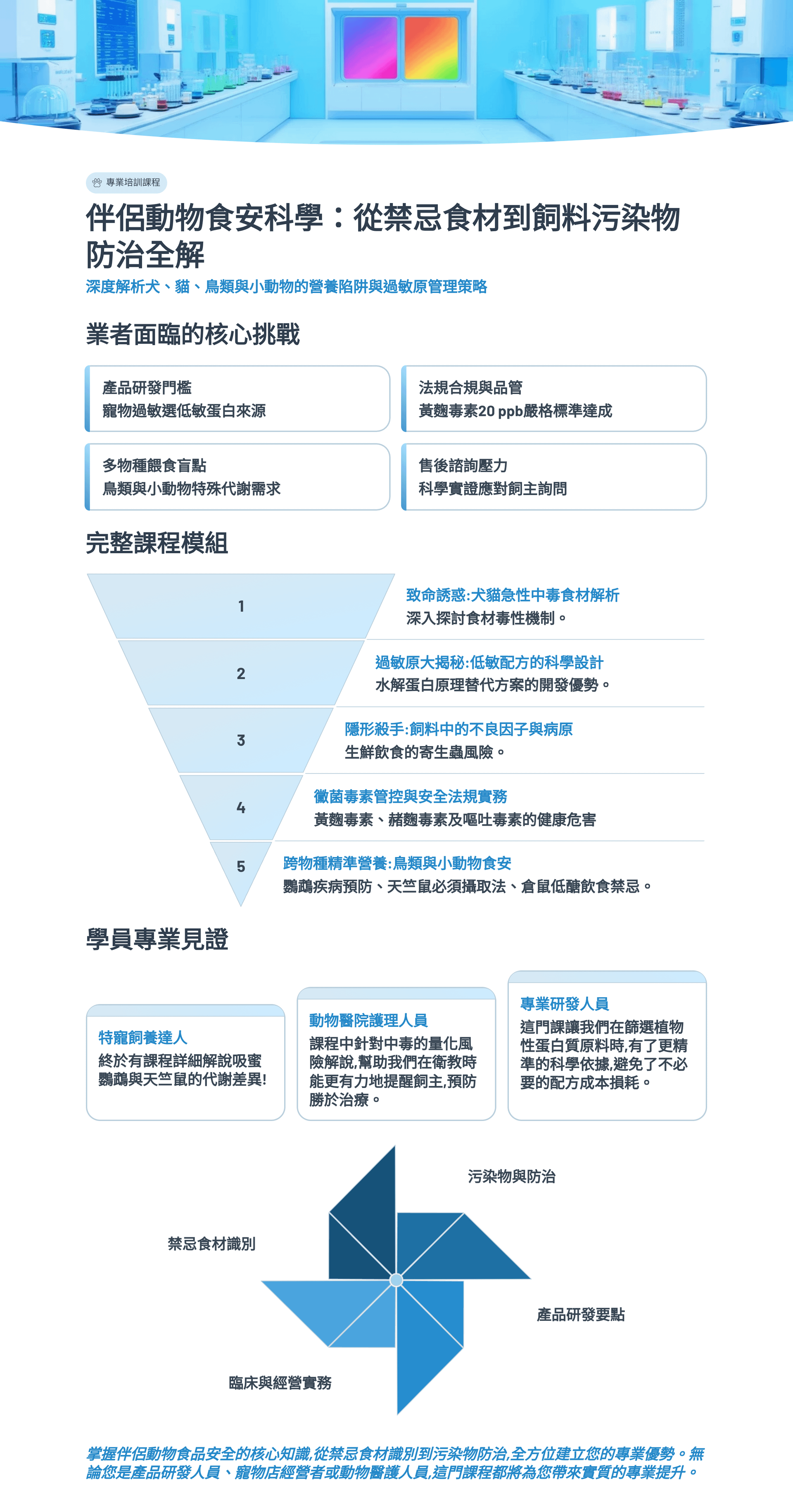 本課程由東海大學畜產專家左克華教授執教,將深入剖析講義中超過 40 種有害物質。這不只是一門科學課,更是一份協助業者避開「品牌回收(Recall)危機」的實戰指南。我們將從生理病理學出發,告訴您哪些原料絕不能碰、哪些原料需要嚴格限量,以及如何透過科學數據,打造出讓消費者真正放心的「低致敏、零汙染」高端產品。