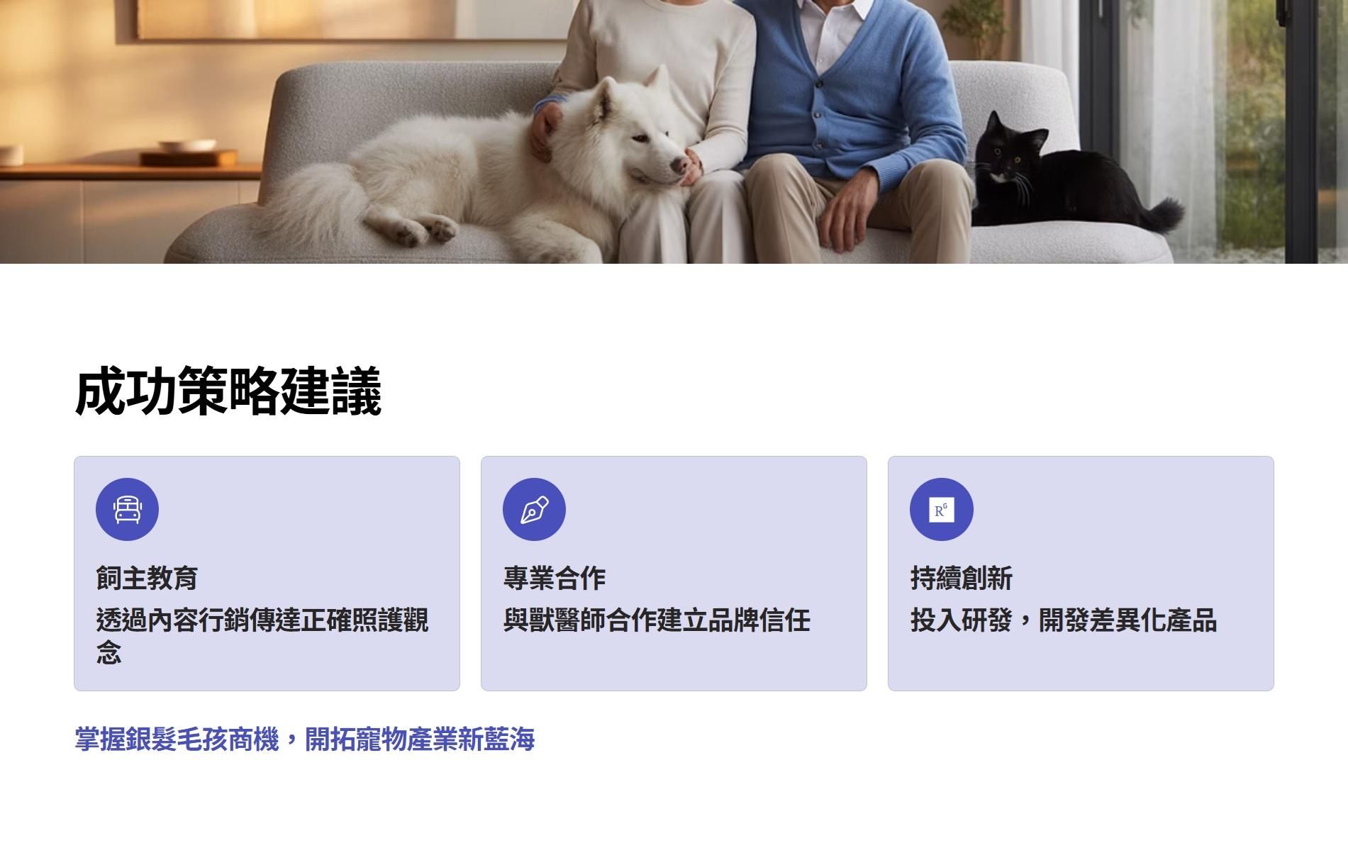 - 跨界合作行銷:結合獸醫師、寵物服務業共同舉辦高齡寵物健康活動,利用專業背書建立品牌信任,同時增加目標客群接觸管道。