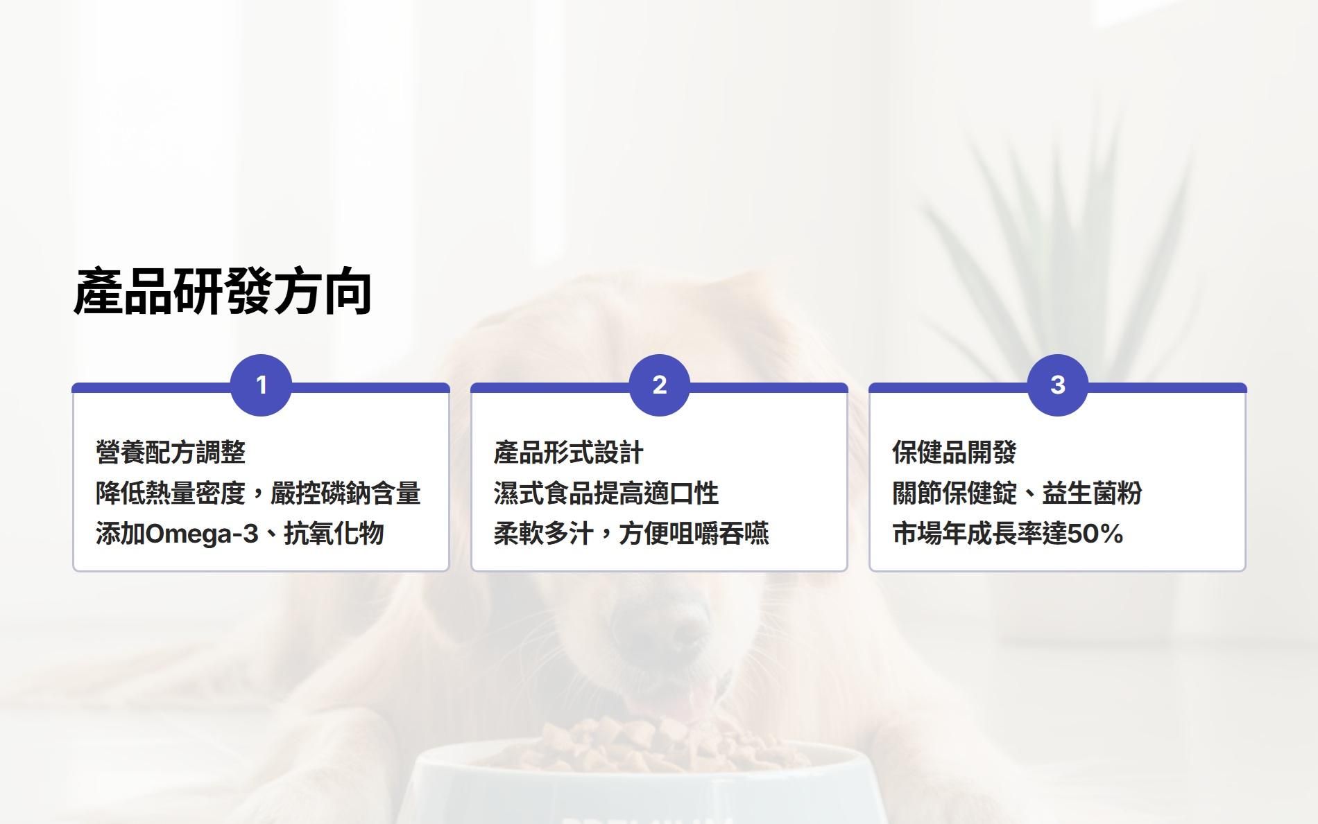 - 研發適齡產品:調整配方滿足高齡毛孩營養需求,例如低熱量、高消化率蛋白、關節與腦部保健成分等,開發多元產品形態提升適口性。