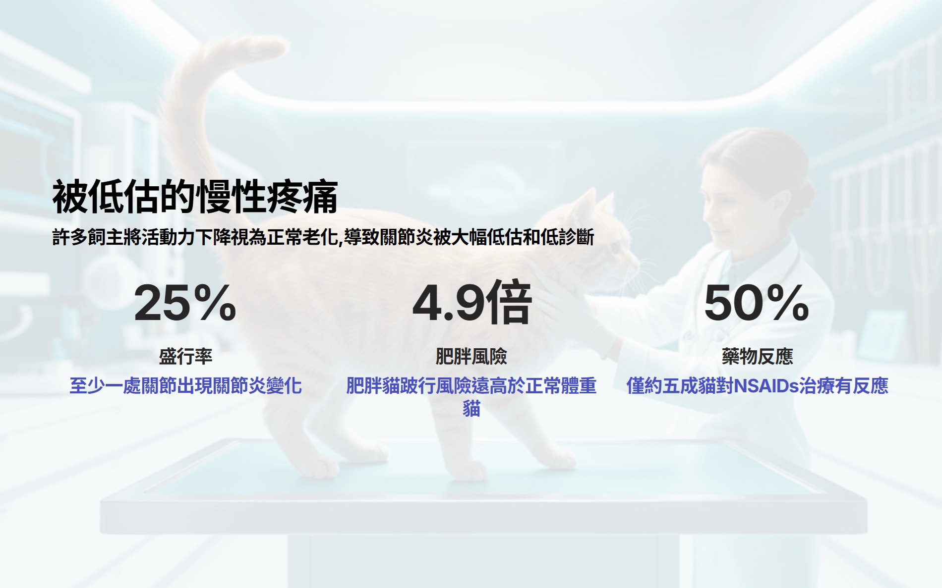 貓的骨關節炎(OA)是一種退化性關節疾病,在高齡貓中非常常見,是導致慢性疼痛的主要原因之一。彙總多項研究發現,約有25%的一般貓隻在至少一處關節出現 X 光下的關節炎變化,但實際盛行率可能更高。許多飼主往往將貓咪活動力下降或行為改變視為正常老化現象,而未意識到這些其實是關節疼痛的跡象。這造成貓骨關節炎被大幅低估和低診斷,許多患病貓咪的慢性疼痛未能得到及時處理。