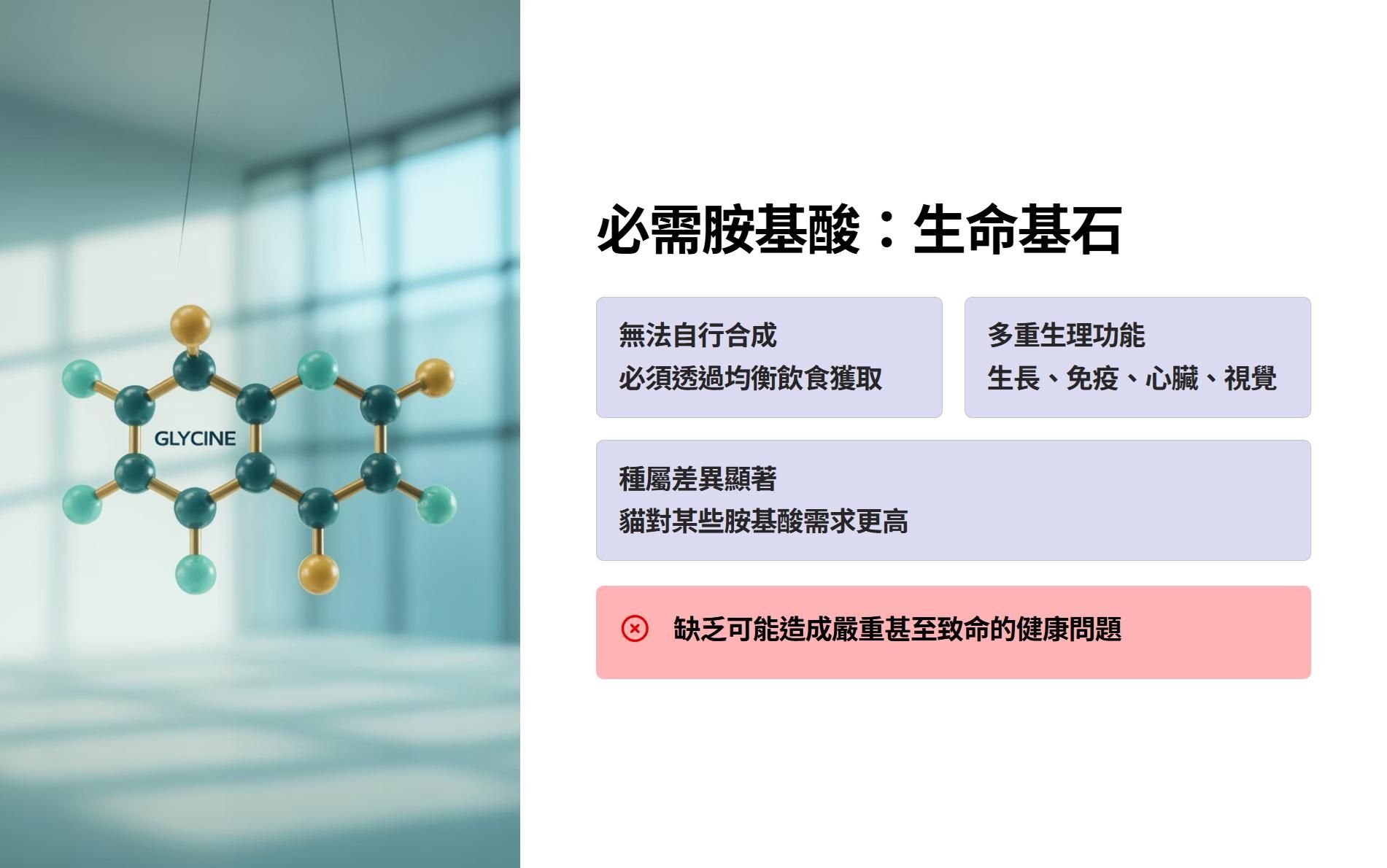 • 功能:建構蛋白質的重要成分,參與膠原蛋白與組織修復,協助免疫系統形成抗體 。犬貓無法自行合成,需由食物提供。