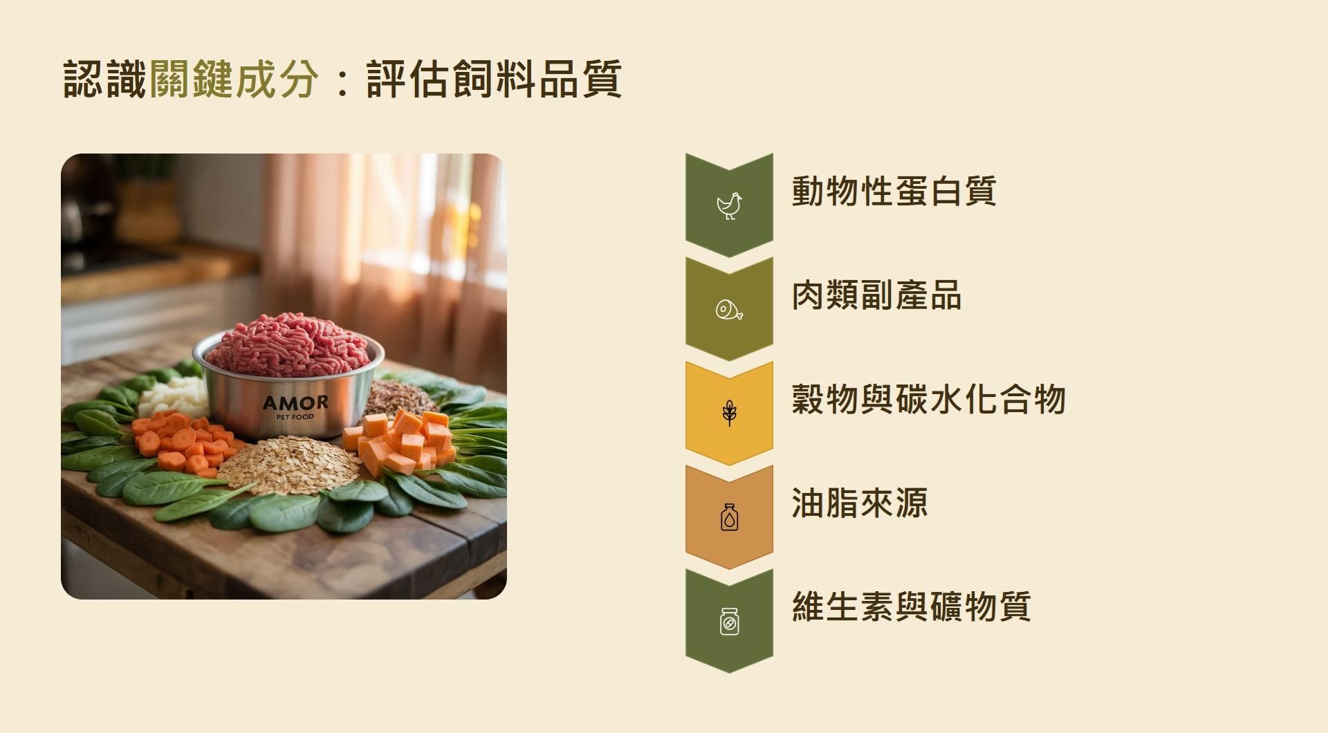 選購飼料時,理解成分列表非常重要。配料通常依重量多寡排序(含水量高的鮮肉排在前可能重量重,但實際乾重不一定最多)。以下是乾飼料中的幾類主要成分: