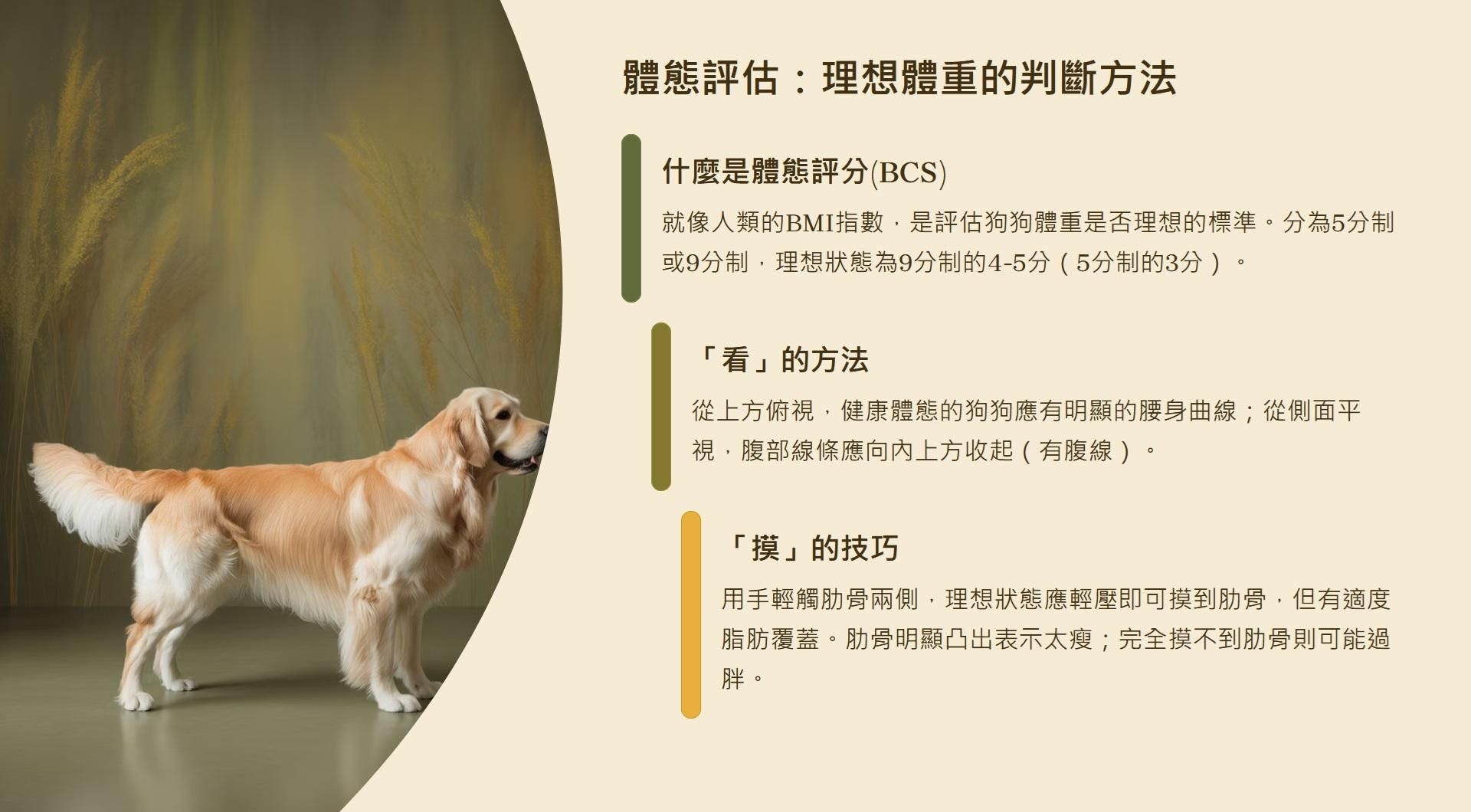 維持理想體態:控制狗狗飲食和運動,讓牠維持在健康的BCS體態標準(9分制的4-5分)。這不僅讓狗狗行動更輕盈,也能降低肥胖相關疾病的風險。