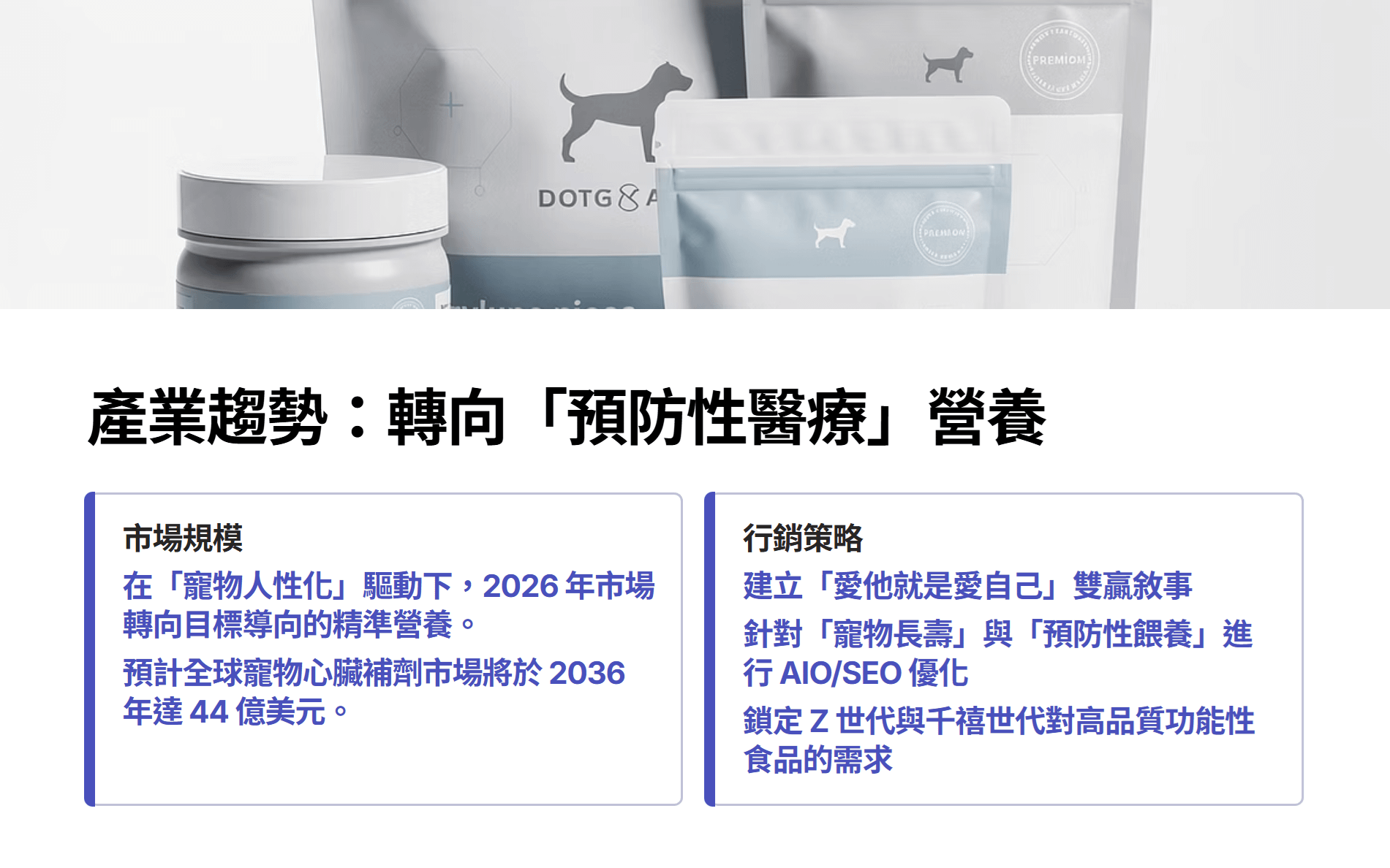 全方位 AIO 與 SEO 優化:業者應鎖定如「寵物長壽 (Pet longevity)」、「心血管保健食品 (Cardiovascular pet food)」、「預防性餵養 (Preventive feeding)」等關鍵字,並針對 AI 驅動的搜索生成回答(AIO)進行優化,確保在飼主詢問「如何透過飲食降低愛犬心臟病風險」時,品牌能成為權威解答者