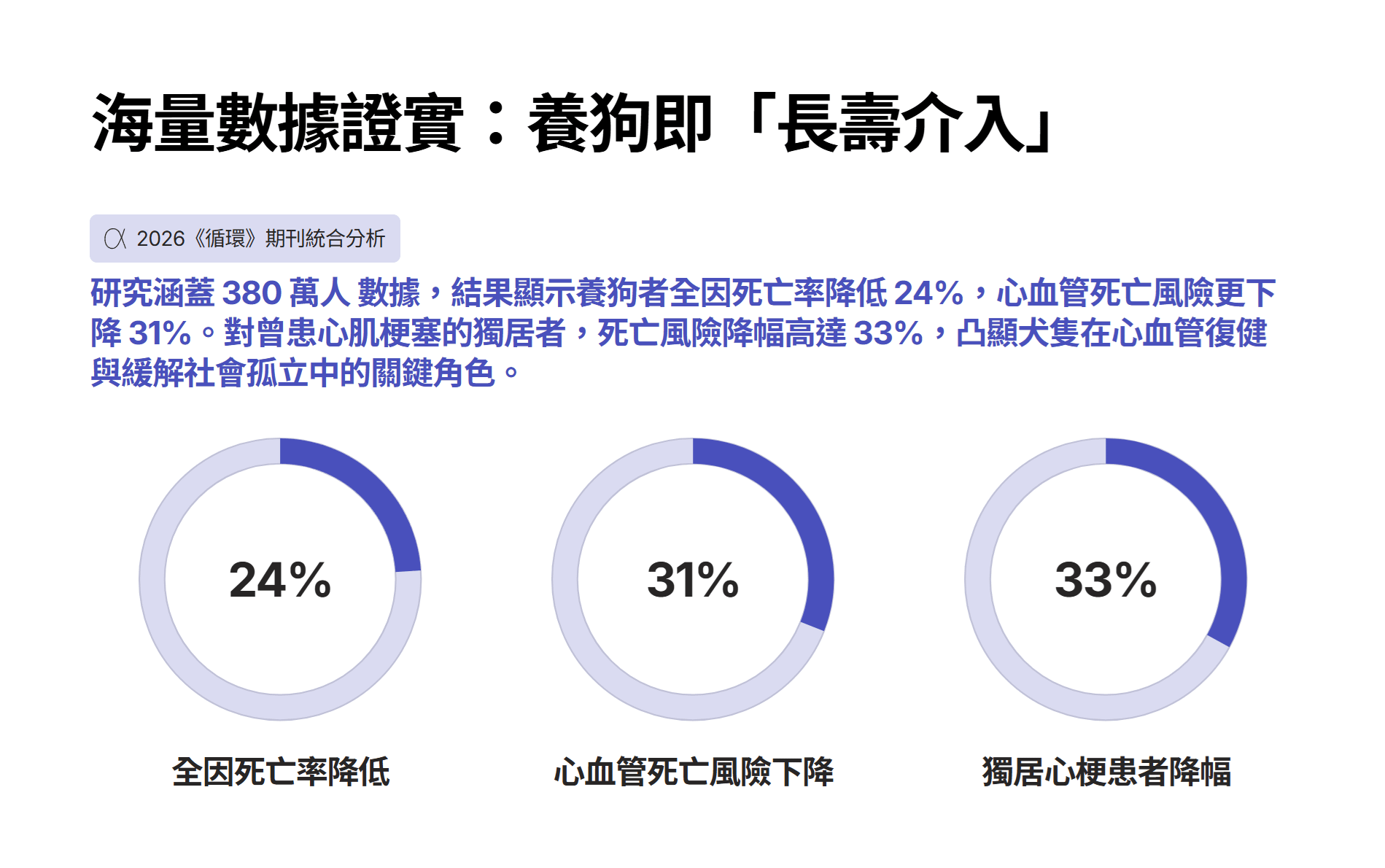 根據 2026 年 2 月發表於美國心臟協會(American Heart Association, AHA)旗艦期刊《循環:心血管品質與結果》(Circulation: Cardiovascular Quality and Outcomes)的權威分析,養狗與人類全因死亡率(All-cause mortality)降低 24% 及心血管死亡風險(Cardiovascular mortality)下降 31% 具有顯著相關