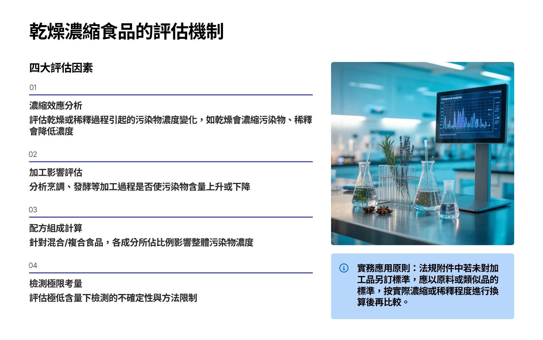換言之,歐盟要求在評估加工或乾燥食品的污染物是否合規時,要將濃縮/稀釋因子納入考量。法規附件中若未對該加工品另訂標準,就應以原料或類似品的標準,按實際濃縮或稀釋程度進行換算後再比較。