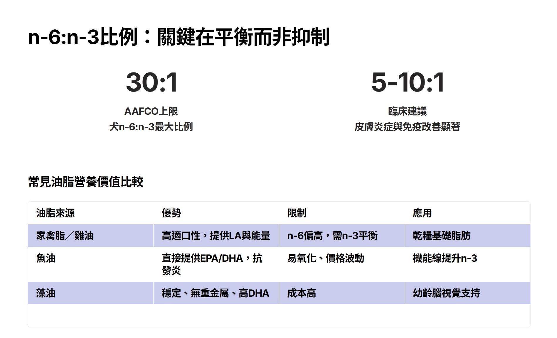 AAFCO:犬n-6:n-3上限30:1,貓無比例建議,但有LA與AA最低量