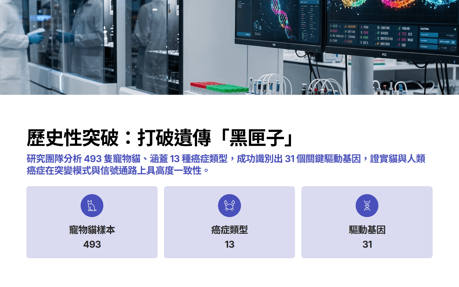 家貓癌症基因研究在 2026 年迎來歷史性突破。由維康桑格研究所與圭爾夫大學領導的國際團隊在《科學》期刊發表了史上最大規模的貓科腫瘤基因圖譜,分析 493 隻寵物貓的 13 種癌症,識別出 31 個關鍵驅動基因,並證實貓與人類在癌症發病機制上具有驚人的生物學相似性。研究發現,貓乳腺癌中普遍存在的 FBXW7 基因突變與人類侵襲性乳腺癌預後高度相關,且對長春新鹼等特定化療藥物展現出顯著的藥敏反應。這項成果不僅打破了貓科腫瘤學的遺傳「黑匣子」,更推動了「健康一體」模式下的跨物種癌症精準醫療,為獸醫師提供了分子層級的診斷基準,並為寵物食品業者開闢了針對特定基因代謝需求的精準營養新市場。