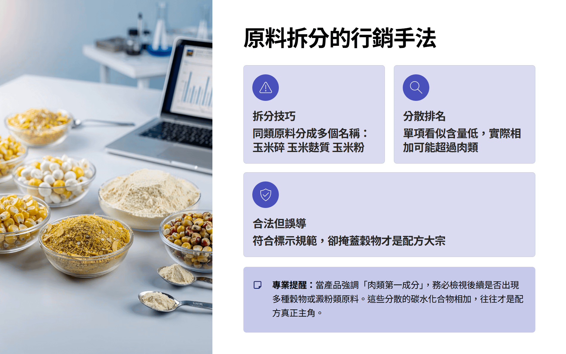 - 留意多重穀物分項:檢查成分表中是否出現多種名稱相似的穀物或碳水化合物(如玉米碎、玉米粉等),這可能是廠商拆分原料以降低穀物排名的手法。協助顧客了解這種標示技巧,以免被「肉類第一」的表面訊息所迷惑。