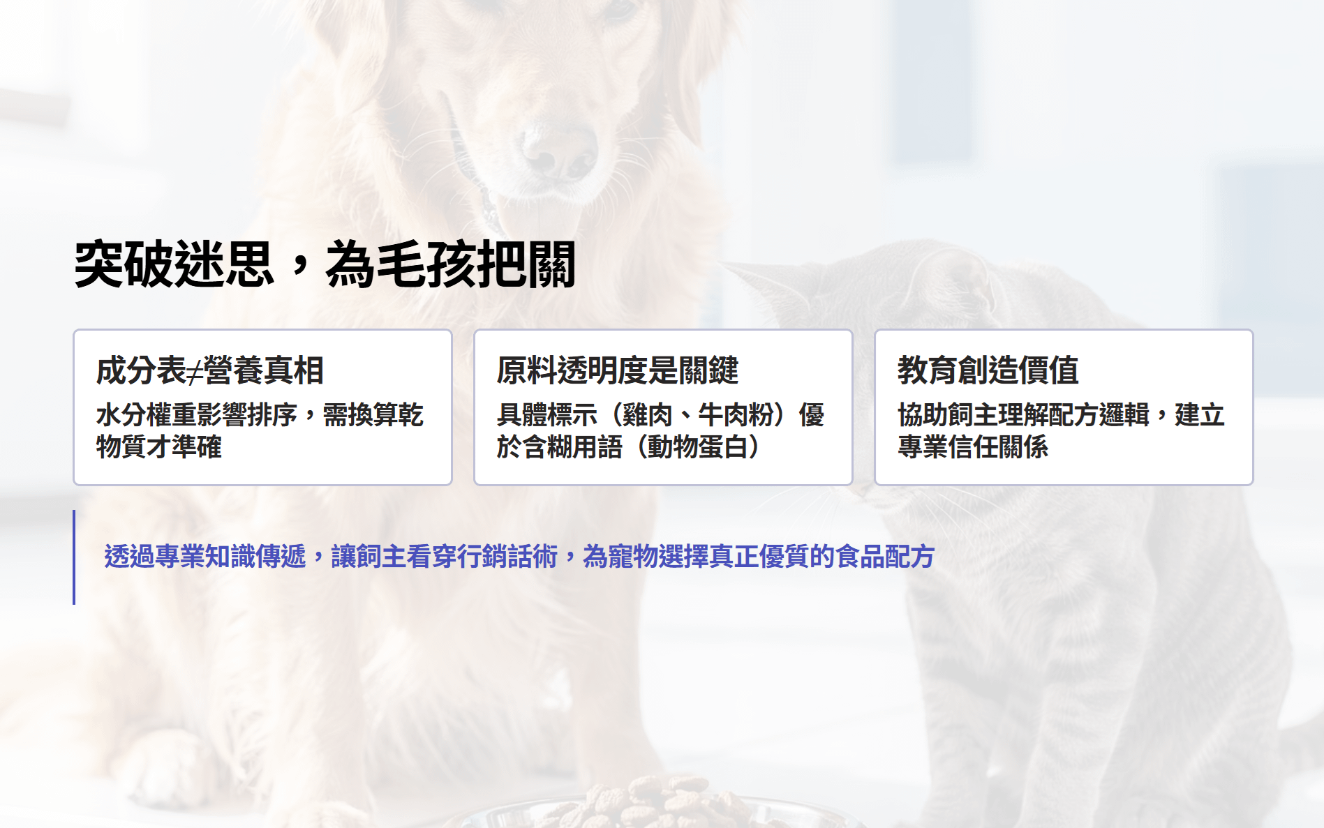 身為業者,我們須協助飼主看穿上述行銷技巧,將重點放回配方本身的營養組成。提醒飼主注意成分表的前幾項原料及其總體比例,而非僅執著於「第一成分」字眼。同時解釋乾物質換算的重要性,例如乾糧與罐頭濕糧營養標示的比較,需要以乾物基礎計算才公平。讓顧客明白:原料名稱愈透明具體(如標明雞肉、牛肉粉)、來源愈單純,通常代表配方真實度越高;反之,含糊的用語(例如「動物蛋白」「植物副產品」)或一連串似乎不同但實則相關的成分,都值得提高警覺。總而言之,透過教育飼主理解成分排序與配方真相,我們能建立起專業信任,避免消費者被華麗宣傳誤導,為毛小孩選擇真正優質適合的食品。