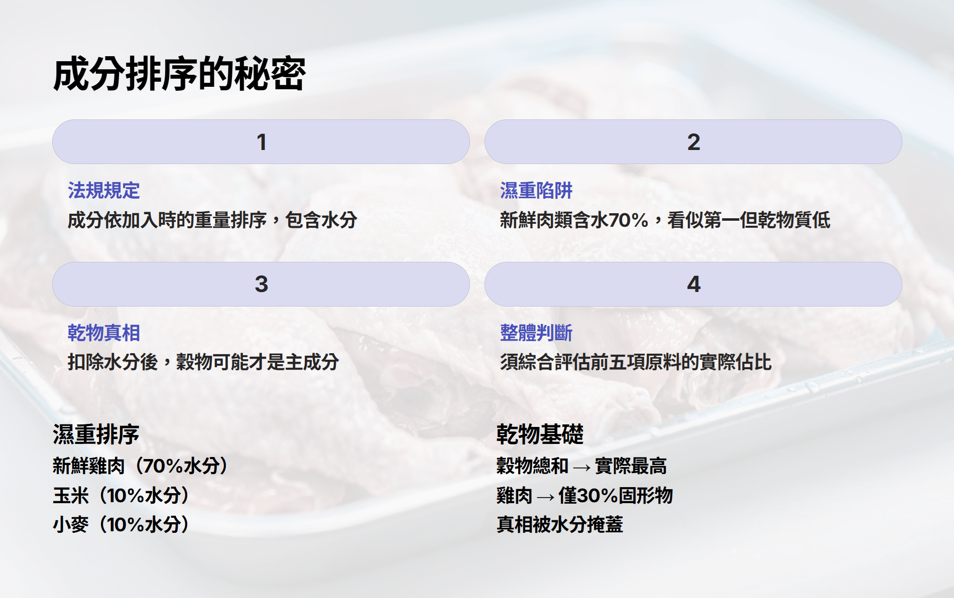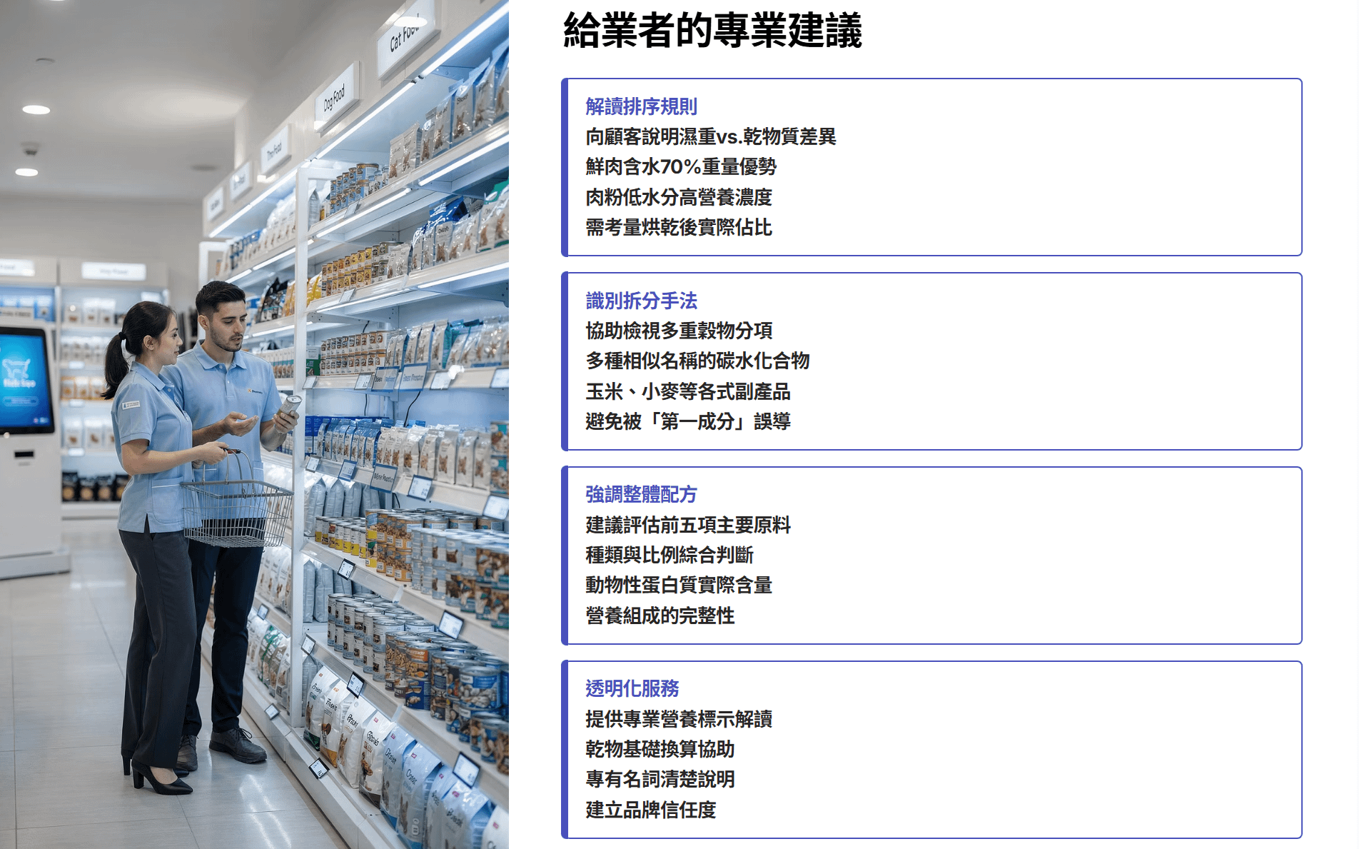 - 看懂成分排列規則:提醒顧客成分表是按濕重排序,水分含量高的鮮肉常列第一,但不代表營養佔比最高,需要考慮乾物質含量。