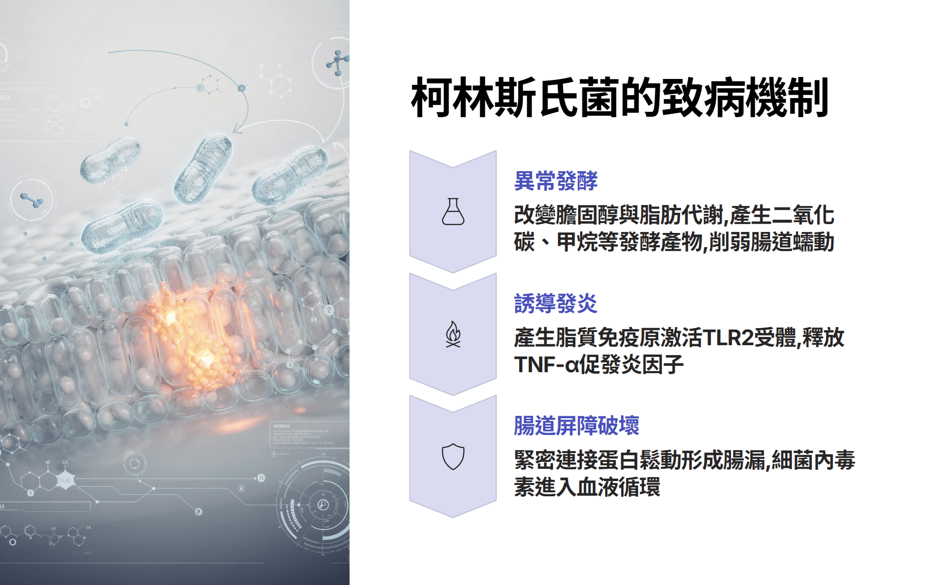 第二,誘導全身性發炎:研究發現柯林斯氏菌(如 Collinsella aerofaciens)能產生一種特定的脂質免疫原。這種物質能直接激活宿主先天免疫系統中的「類鐸受體 2」(TLR2),進而觸發樹突狀細胞釋放強效促發炎細胞因子,如腫瘤壞死因子-α(TNF-α)
