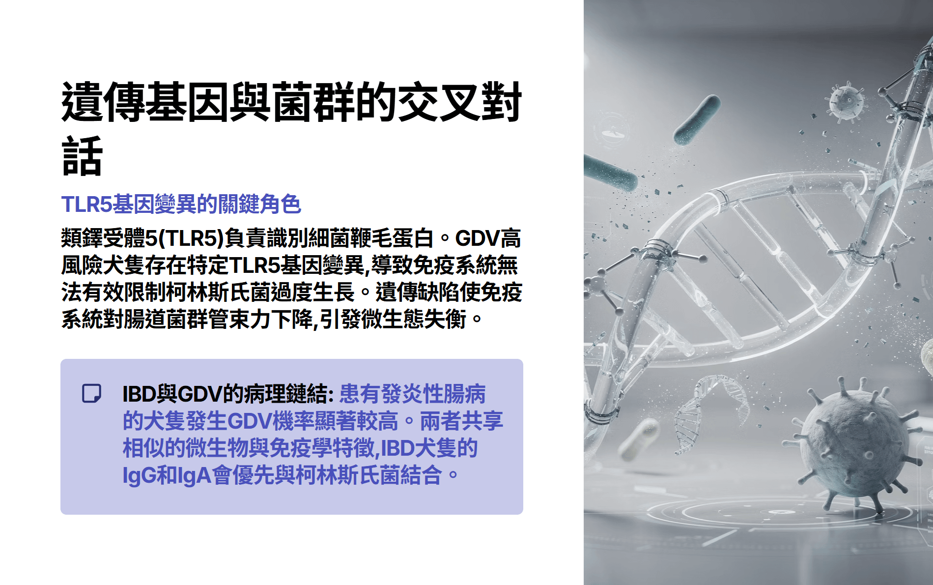 類鐸受體 5 (TLR5):TLR5 負責識別細菌的鞭毛蛋白(Flagellin)。在 GDV 高風險犬隻中,研究人員發現了特定的 TLR5 基因變異。當 TLR5 功能異常時,宿主的免疫系統無法有效監控和限制某些特定微生物(如柯林斯氏菌)的過度生長