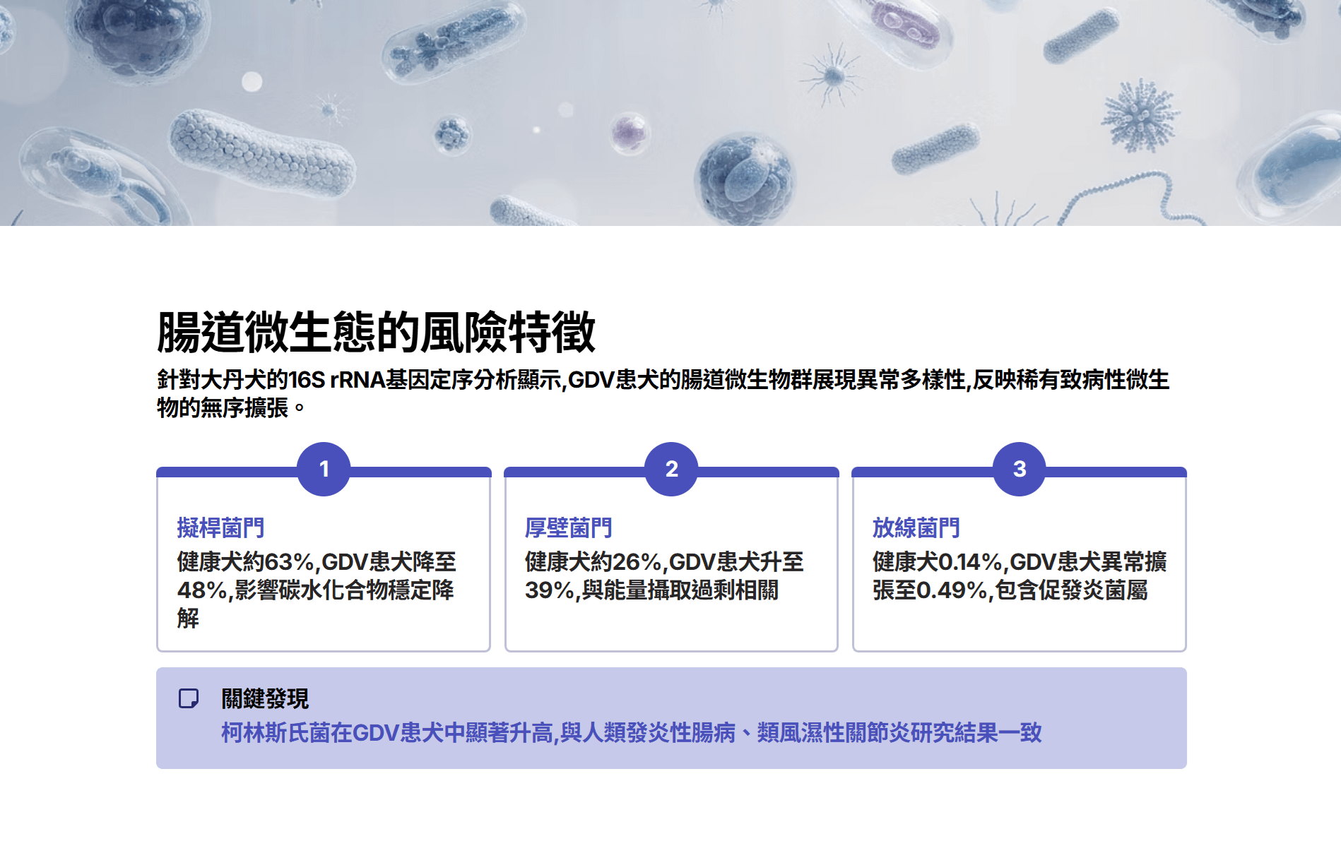 | 微生物分類指標 | 健康犬隻特徵 | GDV 患犬特徵 | 生物學意義 |