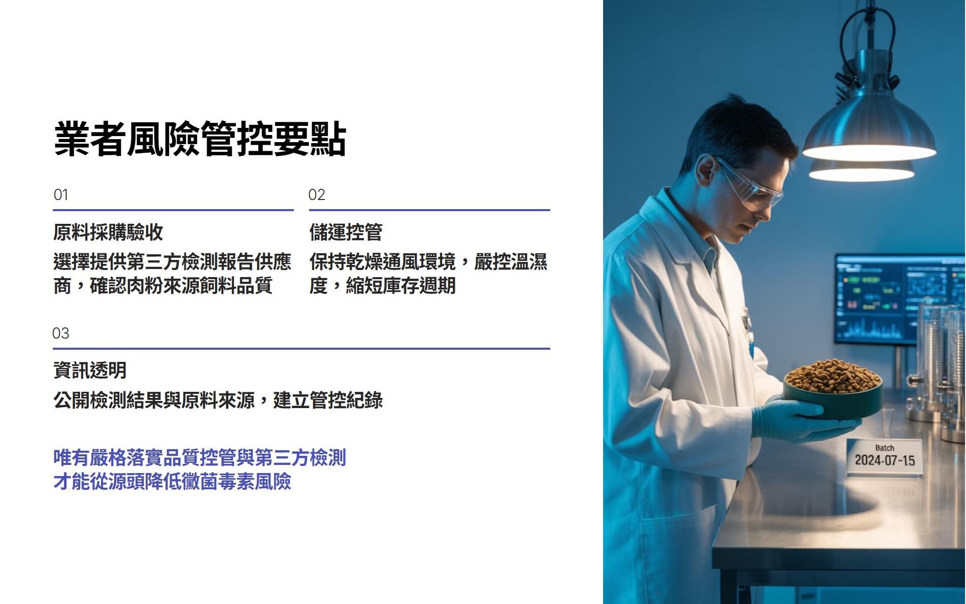 - 原料採購與驗收:選擇提供第三方黴菌毒素檢測報告的供應商,避免使用來源不明或品質不佳的原料。肉粉等動物性副產品應確認供應端飼養飼料品質。