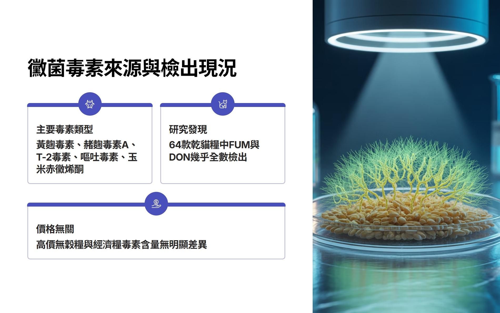 以 Grandi 等人(2019)分析市售 64 款乾貓糧為例,FUM與 DON 幾乎在所有樣本中被檢出,且高價 Premium 無穀糧與一般經濟糧的毒素含量無明顯差異,部分無穀配方甚至檢出 T-2 毒素等高毒性代謝物[5]。2010 年一項犬貓飼糧調查中,含穀配方 DON 陽性率達 83%(中位 308 µg/kg),ZEN 陽性率為 47%,FUM 陽性率為 42%[6];而近年雖然無穀配方普遍檢出率較低,但仍偶有 DON 微量驗出(約 21–42 µg/kg)[7]。