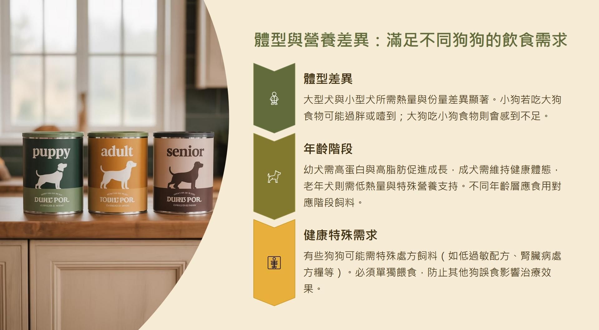 年齡與生命階段:幼犬、成年犬和老年犬所需的營養比例差異很大。幼犬處於成長發育期,需要更高的蛋白質、脂肪和某些維生素礦物質;成年犬則維持在健康體態為主;老年犬可能需要較低熱量、關節保健等特殊配方。獸醫營養學專家明確指出,幼犬不應長期吃成犬飼料,成犬也不該長期吃幼犬飼料,否則都有健康風險:幼犬吃成犬配方可能營養不足導致骨骼、皮膚毛髮發育問題,而成年狗若一直吃幼犬飼料則容易營養過剩肥胖,進而引發其他疾病。因此,針對不同年齡層的狗狗,應選擇對應階段的優質配方飼料。此外,如果家中有幼犬和成年犬同時存在,最好分開餵食:可以讓活潑的幼犬在廚房用餐,而安排年長的狗狗在安靜的房間享用牠的特別配方,避免彼此干擾。