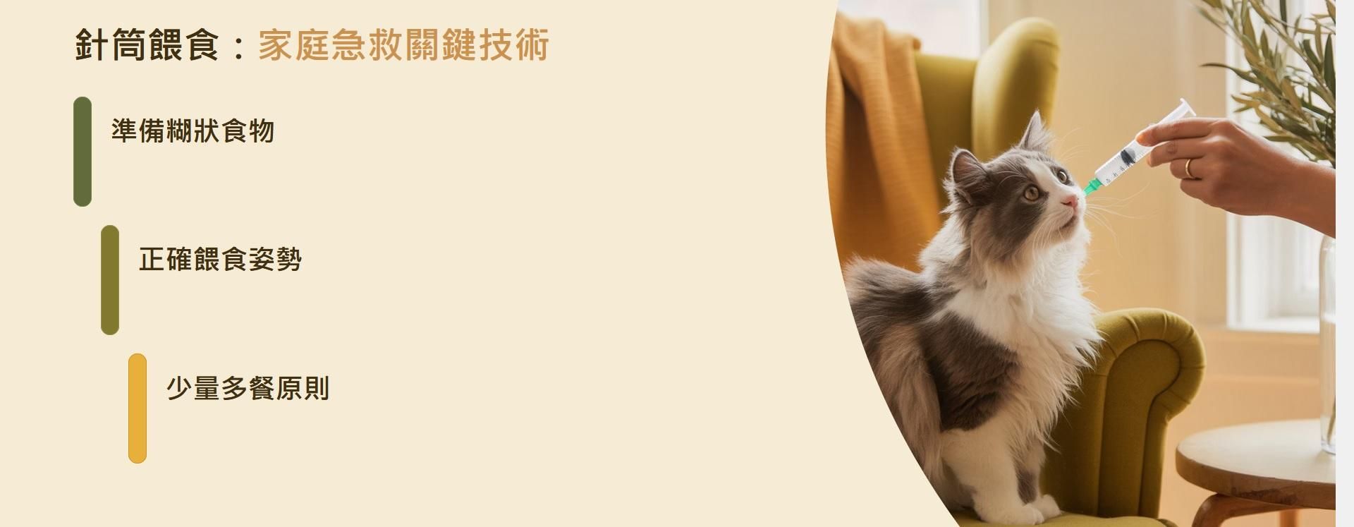針筒餵食是一種簡易的家庭急救方式,可在獸醫指導下使用。首先,準備適合餵針筒的食物:可用湯匙將罐頭或營養糊置於攪拌機中攪拌成細滑泥糊,避免顆粒堵塞針筒管口。然後用食物泥填滿適當大小的針筒。餵食時,將寵物頭部保持平直(下巴微抬平行地面),將針筒尖端輕輕置於口角(兩頰肉邊緣)。每次緩慢壓注1–3 mL食物,然後停頓等待寵物自然吞嚥。切記每次只給少量,頻率要高(可一天多餐),讓寵物有充分時間吞嚥,避免一次灌入過多而引起噎到。餵食時可注意寵物的吞嚥節奏,若食物流質比重較高,可將食物注入口腔邊頰內側(靠近臼齒區)讓寵物舔食。※注意:絕對不要把針筒嘴伸進牙齦以內,只對準口角即可。也不要快速按壓,否則可能把食物噴入氣管造成吸入性肺炎。若寵物抗拒或出現嘔吐、呼吸困難等情形,應立刻停止餵食並就醫。貓咪特別容易因強行餵食而產生食物「厭惡感」,建議先用湯匙試誘食或諮詢獸醫指導。