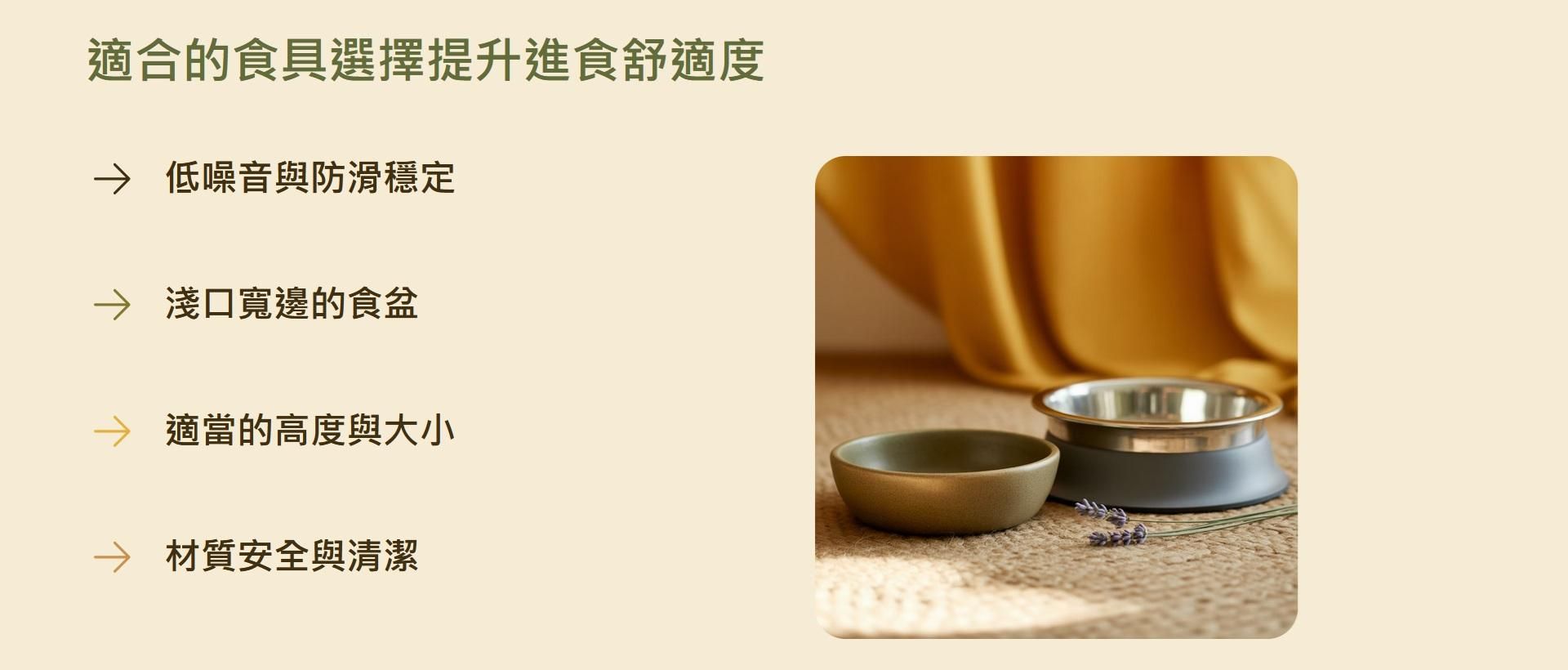 食具講究:選擇防滑又低噪音的穩定食盆,貓用淺寬碗防鬍鬚不適,依寵物體型選擇合適高度與材質。