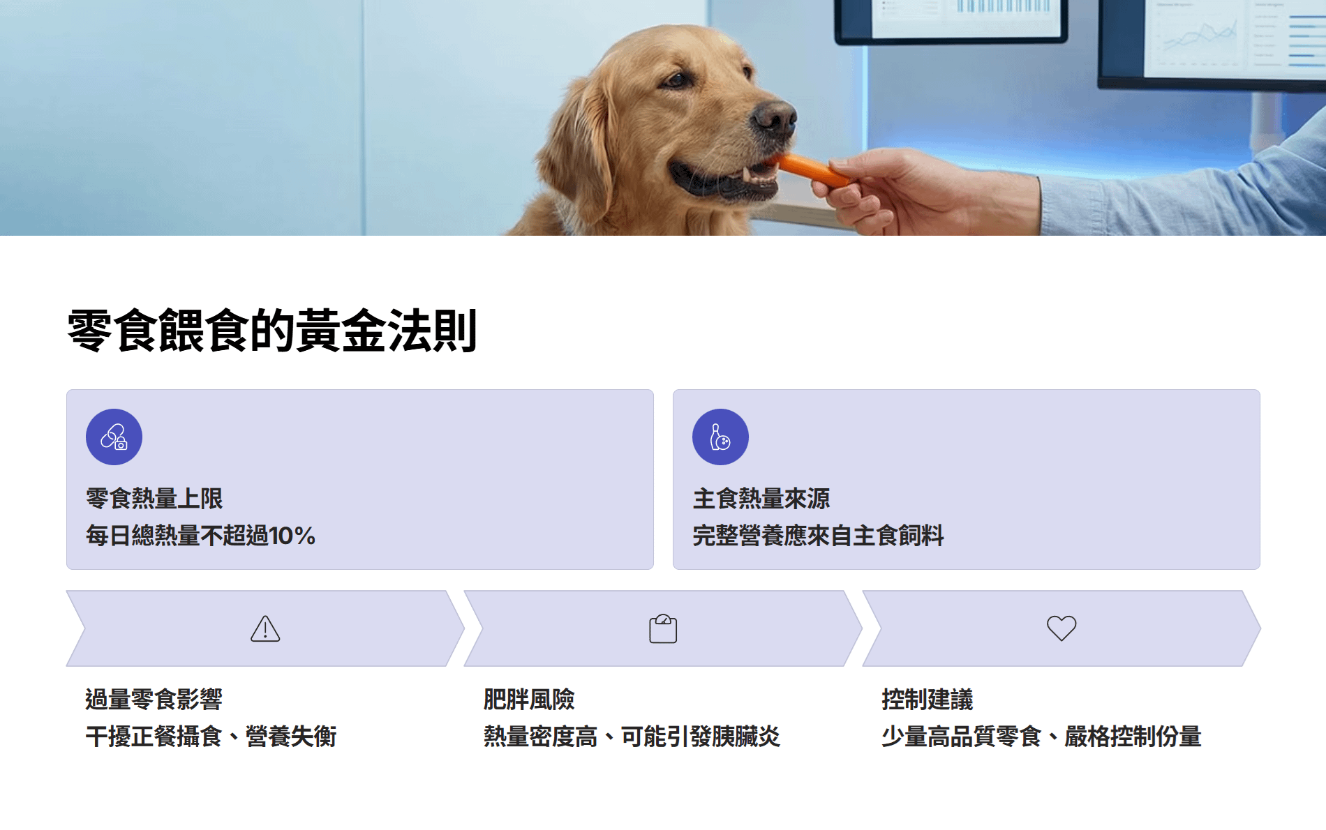 - 建議零食適量原則:**教育飼主遵循「零食不超過每日熱量10%」的原則,並選擇健康低熱量的獎勵品。例如,推薦使用蔬果片等低卡零食替代高熱量點心,同時提醒依寵物體型調整零食量,避免過量導致肥胖。