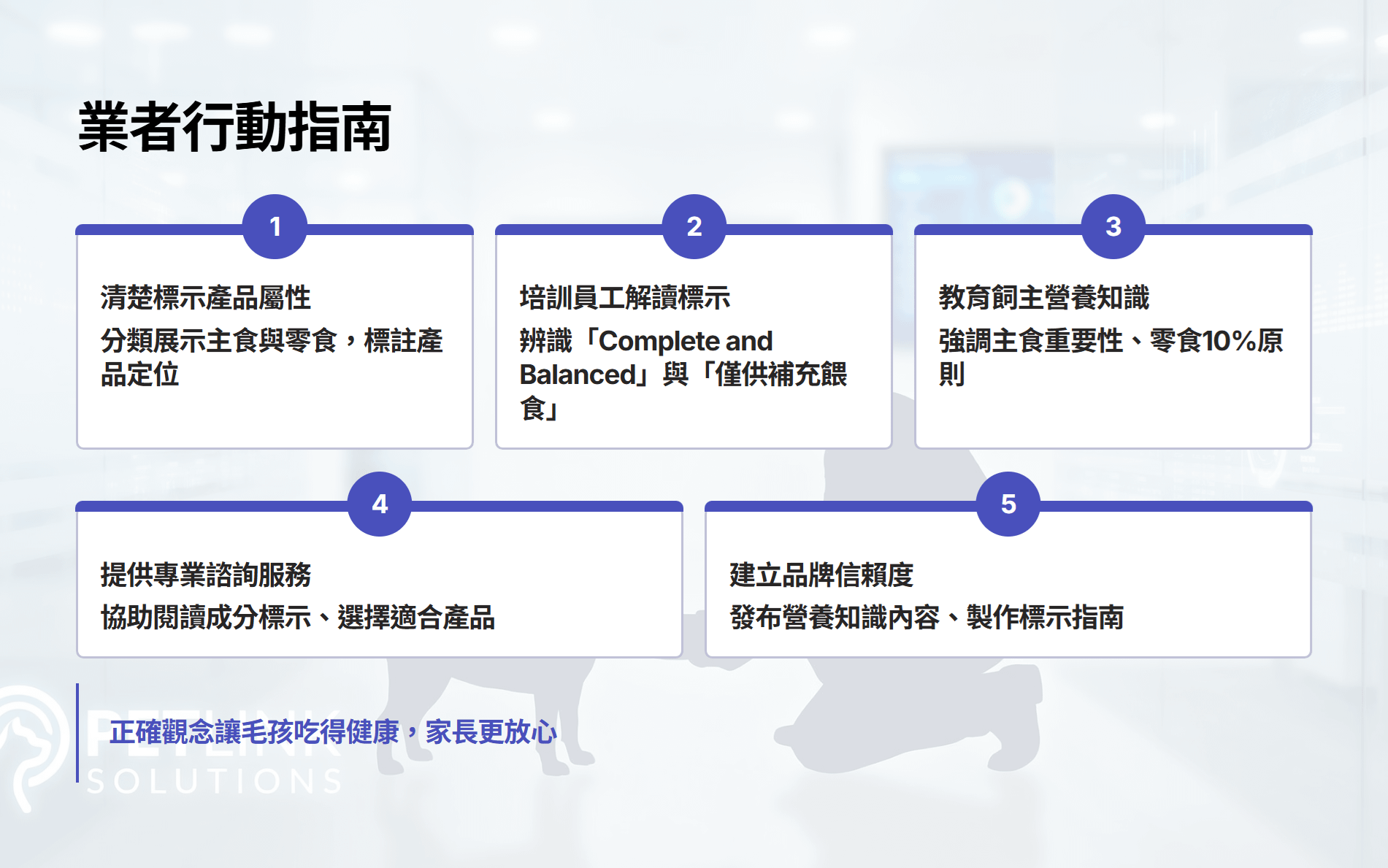 - 提供附加價值服務:可制作簡單易懂的寵物食品標示指南給顧客,或在社群媒體發布營養知識圖表,提升品牌專業形象。當顧客感受到業者對毛孩健康的重視,將提高對通路的信賴度與黏著度。