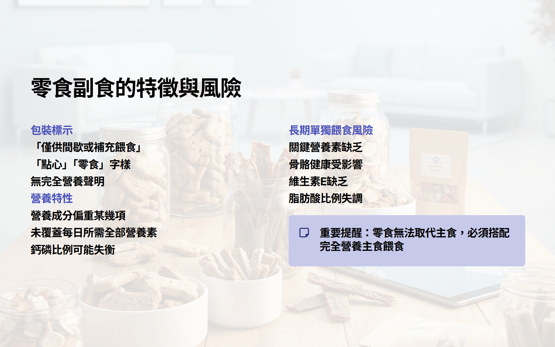 寵物食品常見主食飼料與零食(副食)兩大類,包裝標示是判別關鍵。完全營養主食會標示「Complete and Balanced」(完全營養),表示其含有足夠且均衡的營養,可作為毛小孩唯一長期主食。而零食或補充性飼料通常標示「僅供獎勵使用」或「限間歇餵食」,意即營養未達主食標準,只能作為點心獎勵。業者須引導飼主正確辨識,避免將零食當正餐,導致毛孩營養失衡或健康受影響。