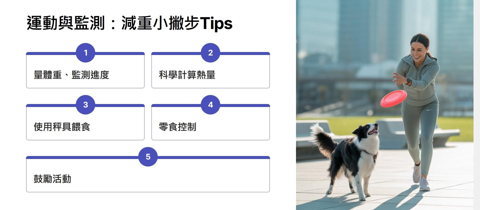 - 量體重、監測進度:每週使用電子秤量體重,記錄體況分數(BCS),隨時掌握減重成效。