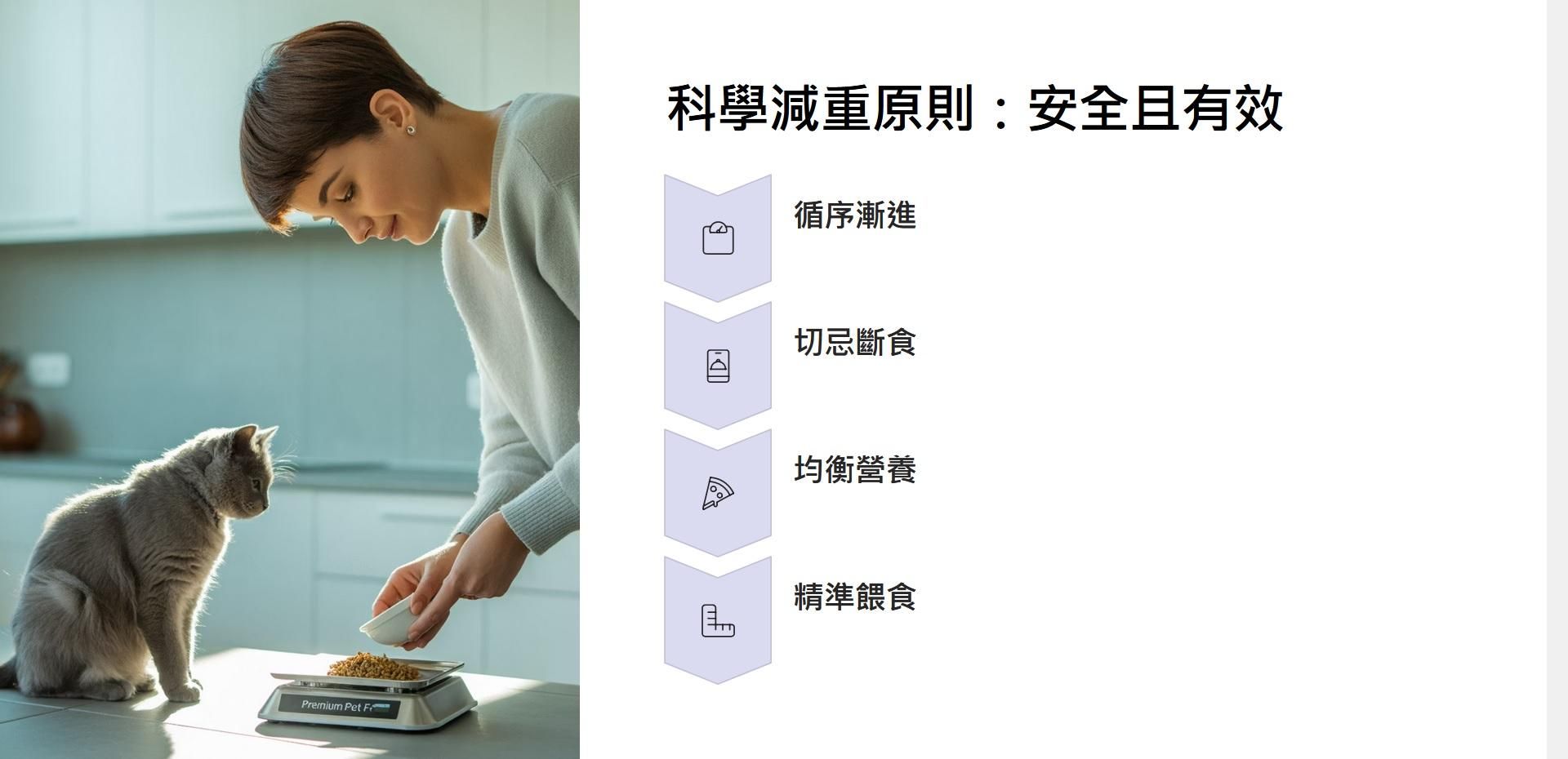 - 科學計算熱量:以理想體重計算基礎代謝率,再扣掉10–20%熱量(依進度調整)。例如貓咪可先按理想體重計算RER後取80%作餵食基準。