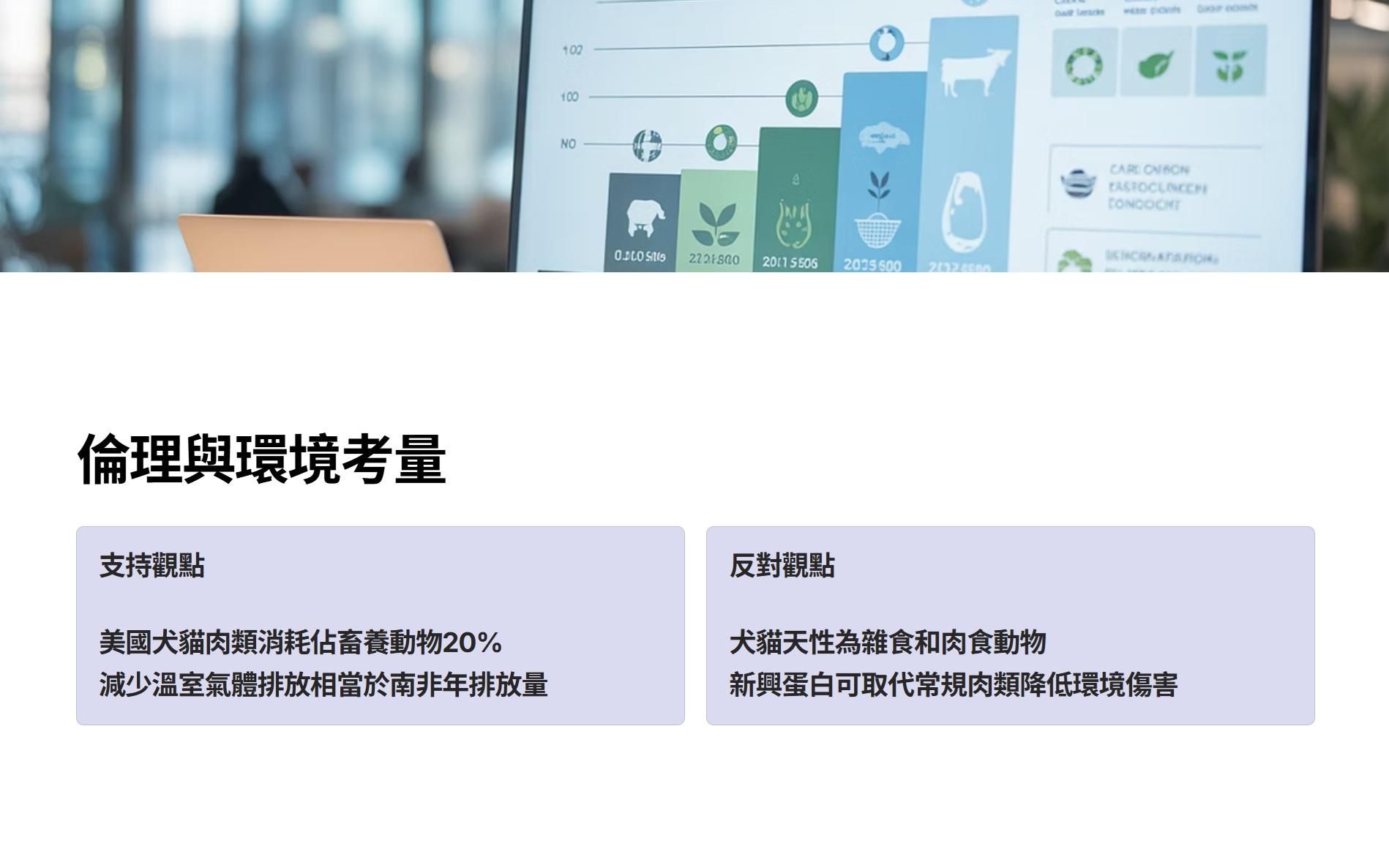 反對者則指出,犬貓演化上是雜食和肉食動物,強行改變其天性飲食可能引發倫理爭議。他們質疑讓貓狗吃素是否真正符合寵物福利,擔心為了保護農場動物卻犧牲自家寵物的健康。此外,在環境層面也有不同聲音。有論點認為商業寵物食品的肉類多使用人類食用後的副產品,如內臟、骨粉等,因此寵物食品部分利用了原本可能被廢棄的資源。換言之,犬貓食肉本身並非完全浪費或額外增加屠宰量,因為許多成分是循環利用的產物。然而,儘管存在副產品利用的情形,整體畜牧業的規模仍與寵物食品需求息息相關。因此,批評者認為應在減少畜牧環境負擔與寵物本身營養需求之間取得平衡,不宜一味追求犬貓素食而忽略其本能與健康。同時新興蛋白的興起,可大量取代常規肉類,即可降低環境傷害等議題。