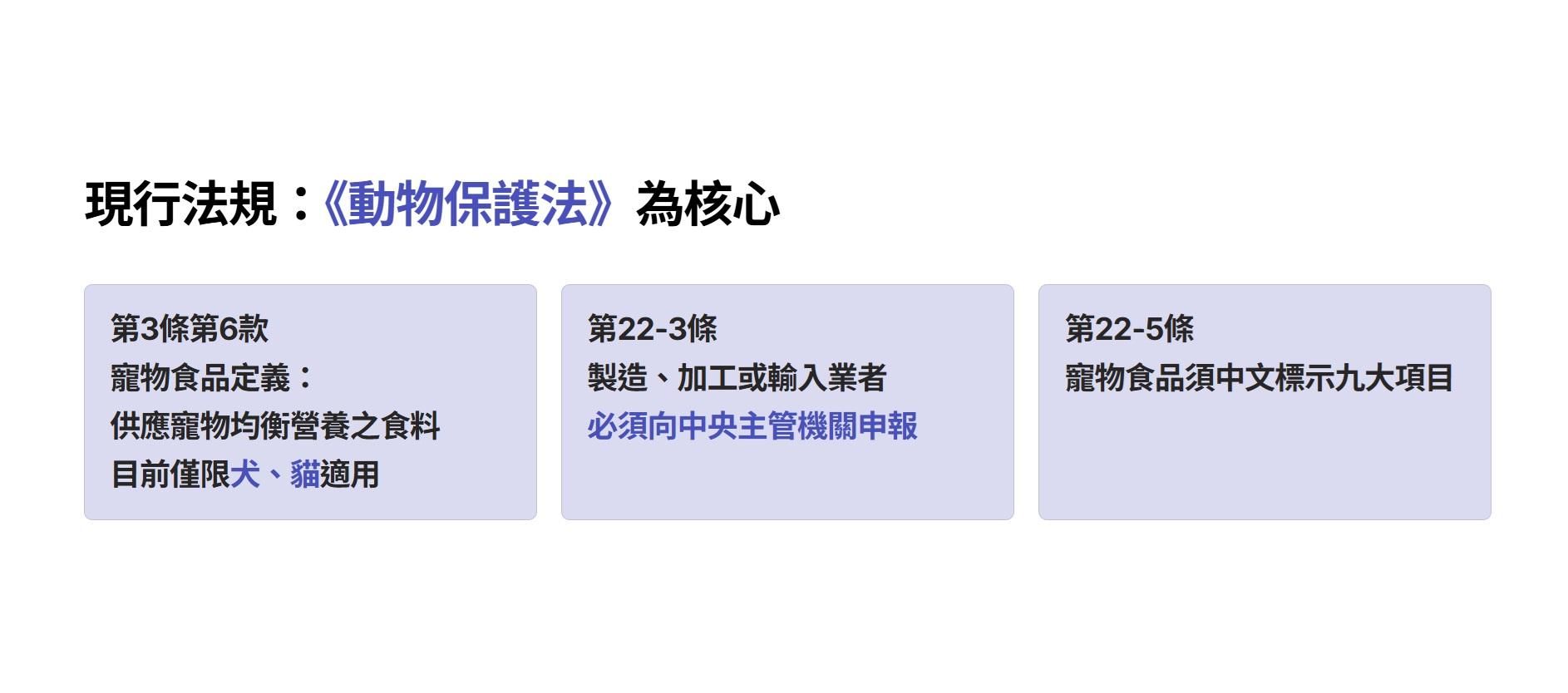 由於農業部在 2024 年 9 月 5 日預告的《寵物食品管理法》草案尚未三讀,目前台灣寵物食品的管理主要依據《動物保護法》中的相關條文。
